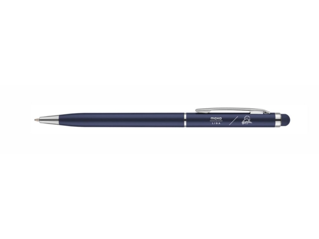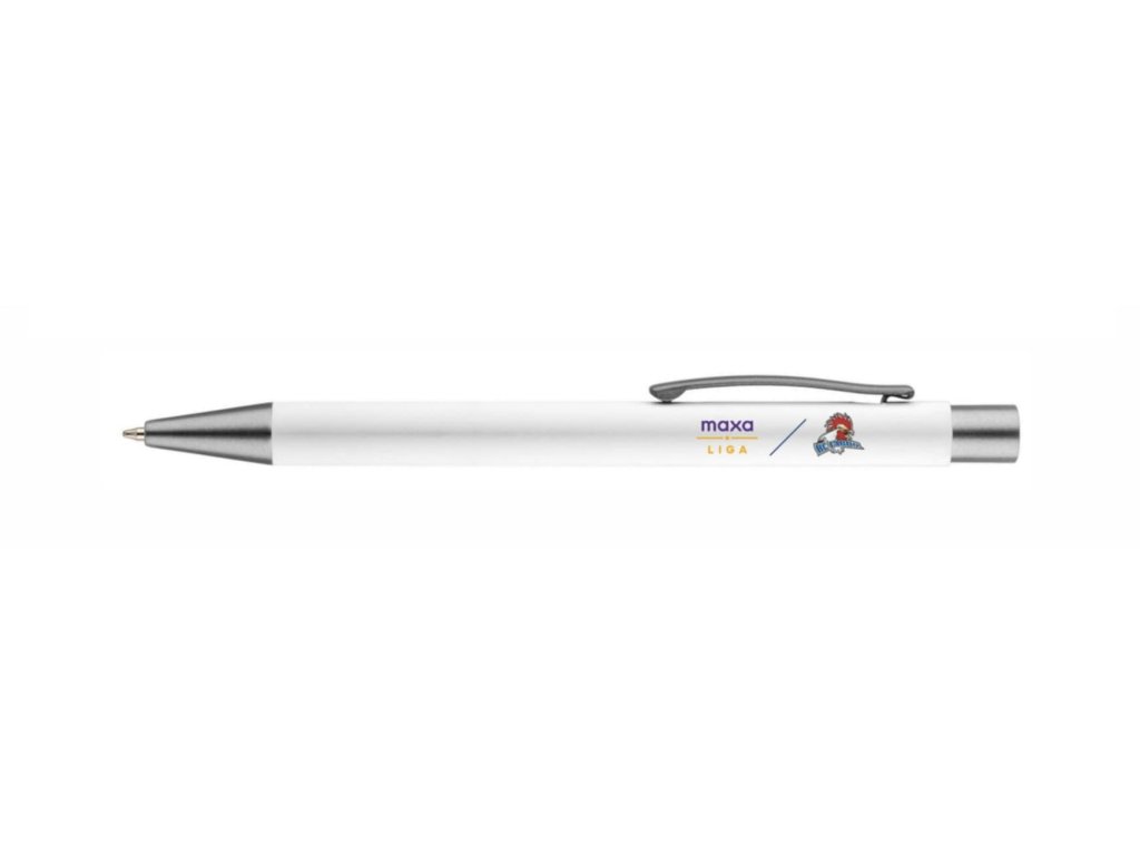 1/ kovová bílá propiska s pogumovaným povrchem s logem Hc Tábor / Maxa (137x10mm), náplň velkoobsahová, materiál kov